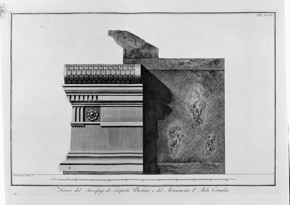 Ti offriamo una riproduzione artigianale su tela dell'opera famosa 'Laterale del sarcofago di Scipione Barbato e il monumento di Cor' di Giovanni Battista Piranesi, dal Museo delle Riproduzioni.