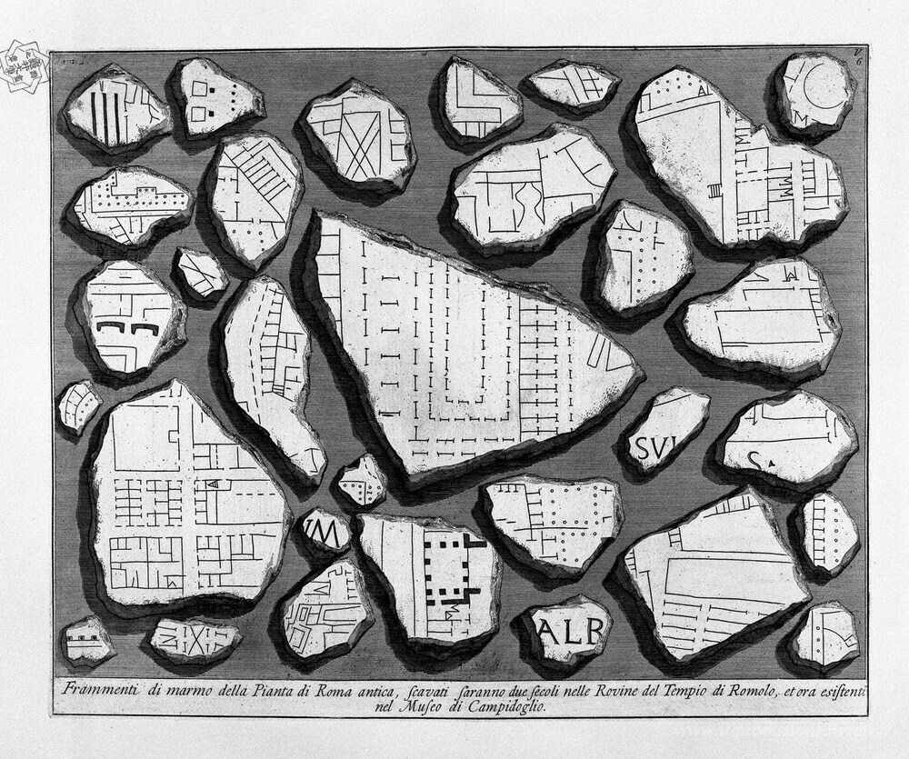 Ti offriamo una riproduzione artigianale su tela dell'opera famosa 'Le antichità romane, t. 1, piastra V. Mappa di Roma antica e For' di Giovanni Battista Piranesi, dal Museo delle Riproduzioni.