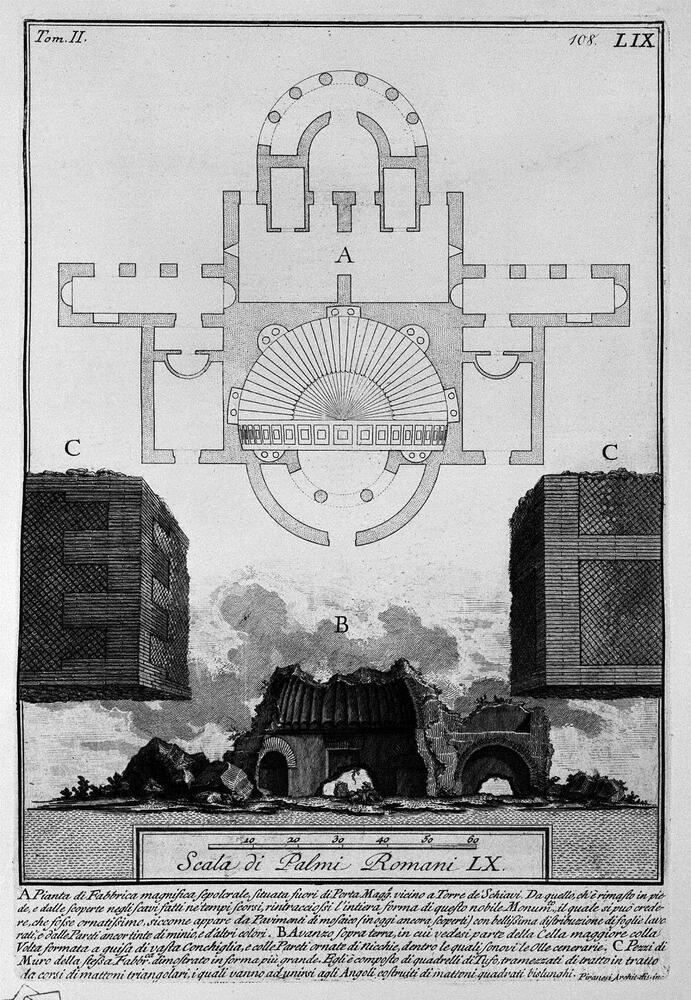 Ti offriamo una riproduzione artigianale su tela dell'opera famosa 'Le antichità romane, t. 2, Piatto LIX. Pianta e alzato di fabbri' di Giovanni Battista Piranesi, dal Museo delle Riproduzioni.