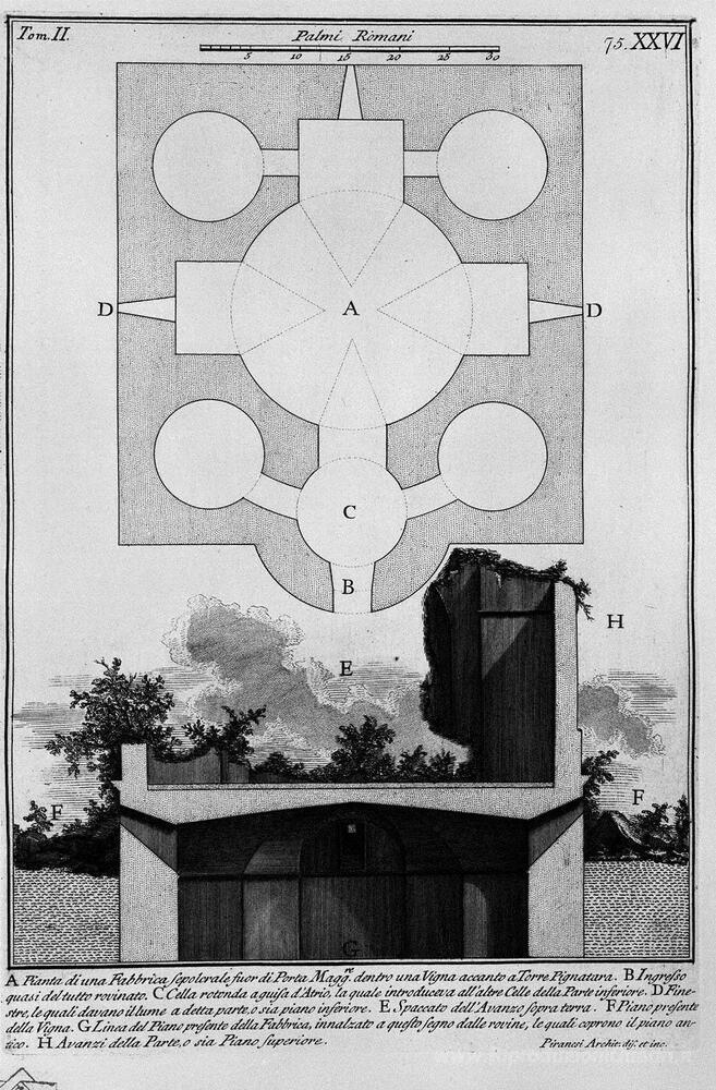Ti offriamo una riproduzione artigianale su tela dell'opera famosa 'Le antichità romane, t. 2, Piatto XXVI. Precedente sezione di gr' di Giovanni Battista Piranesi, dal Museo delle Riproduzioni.