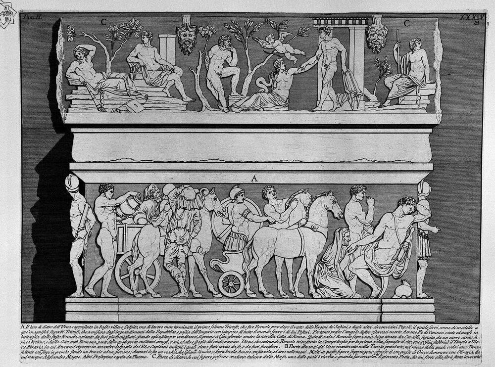 Ti offriamo una riproduzione artigianale su tela dell'opera famosa 'Le antichità romane, t. 2, Piatto XXXIV. Grande urna di marmo ch' di Giovanni Battista Piranesi, dal Museo delle Riproduzioni.