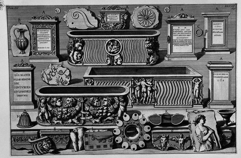 Ti offriamo una riproduzione artigianale su tela dell'opera famosa 'Le antichità romane, t. 3, Piatto XXVIII. Pietre, sarcofagi e al' di Giovanni Battista Piranesi, dal Museo delle Riproduzioni.