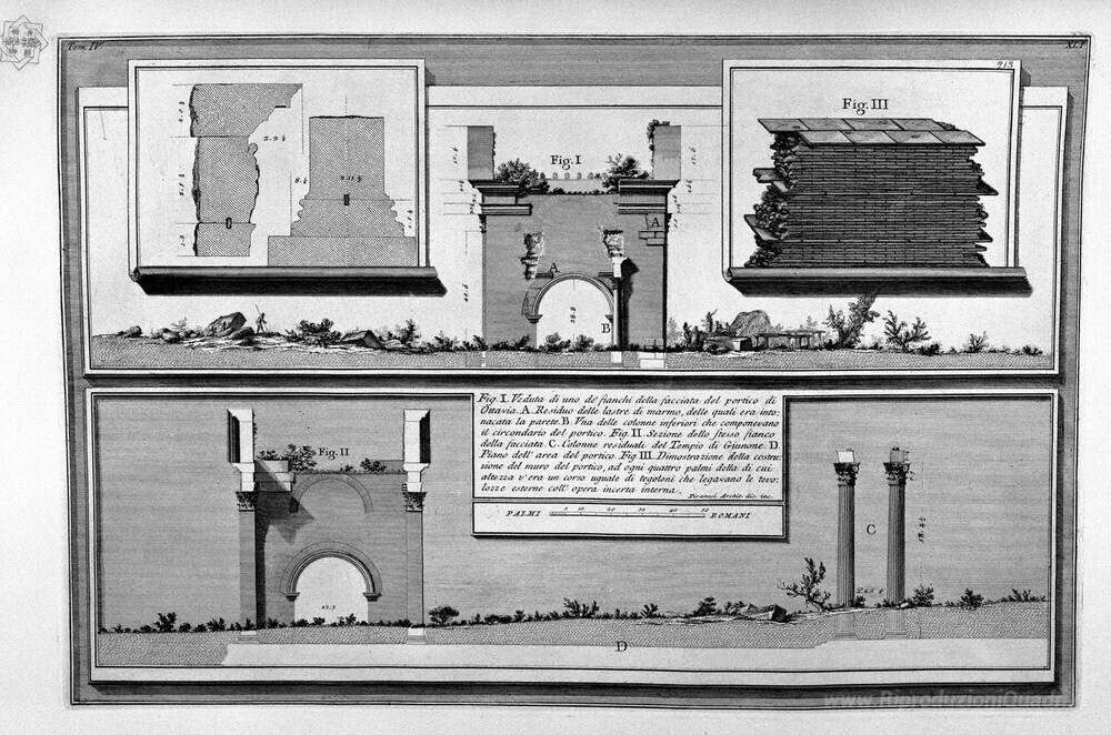 Ti offriamo una riproduzione artigianale su tela dell'opera famosa 'Le antichità romane, t. 4, Piatto XLI. Vista di uno dei lati del' di Giovanni Battista Piranesi, dal Museo delle Riproduzioni.