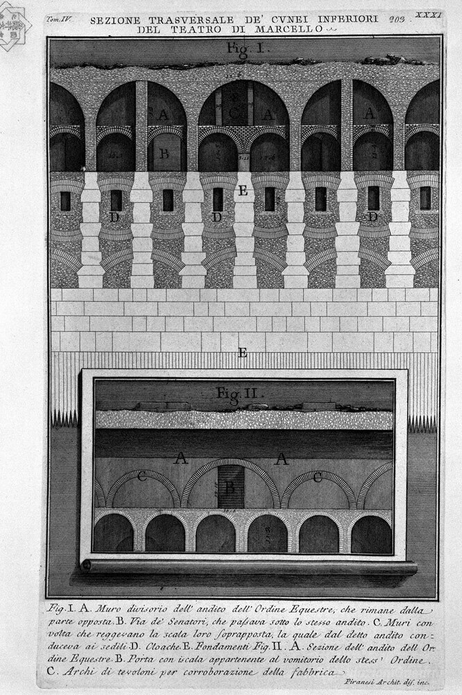 Ti offriamo una riproduzione artigianale su tela dell'opera famosa 'Le antichità romane, t. 4, Piatto XXXI. Sezione uno dei cunei de' di Giovanni Battista Piranesi, dal Museo delle Riproduzioni.