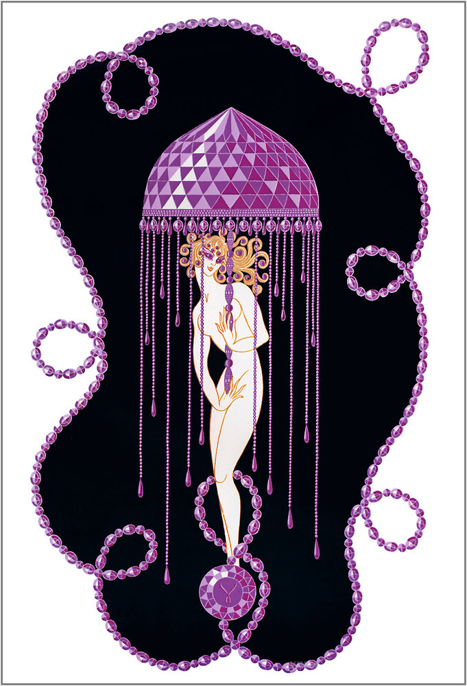 Ti offriamo una riproduzione artigianale su tela dell'opera famosa 'Le pietre preziose, ametista' di Erte, dal Museo delle Riproduzioni.