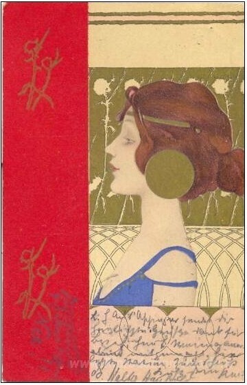 Ti offriamo una riproduzione artigianale su tela dell'opera famosa 'Le ragazze affronta con bordo rosso' di Raphael Kirchner, dal Museo delle Riproduzioni.