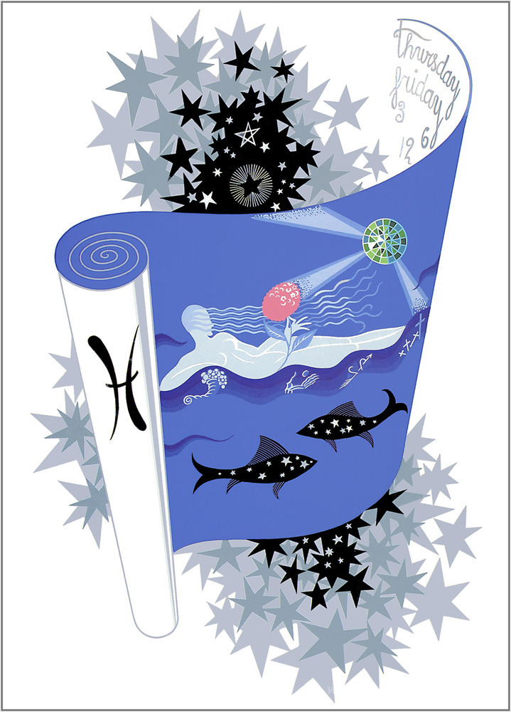 Ti offriamo una riproduzione artigianale su tela dell'opera famosa 'Lo Zodiaco, Pesci' di Erte, dal Museo delle Riproduzioni.