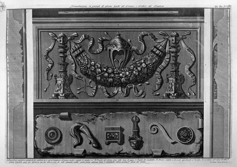 Ti offriamo una riproduzione artigianale su tela dell'opera famosa 'Manifestazione a gran parte del pronao del Pantheon e Portico' di Giovanni Battista Piranesi, dal Museo delle Riproduzioni.