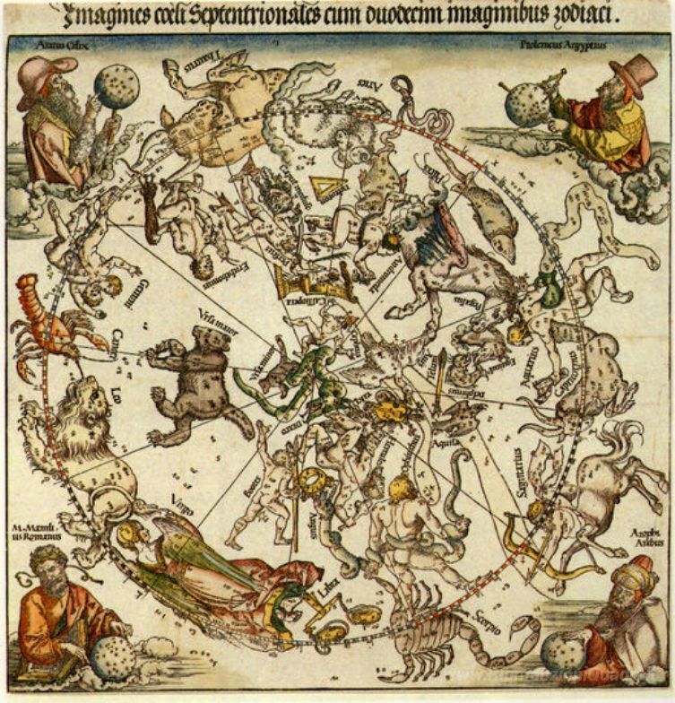 Ti offriamo una riproduzione artigianale su tela dell'opera famosa 'Mappa del Northern Sky con le rappresentazioni delle costellazio' di Albrecht Durer, dal Museo delle Riproduzioni.