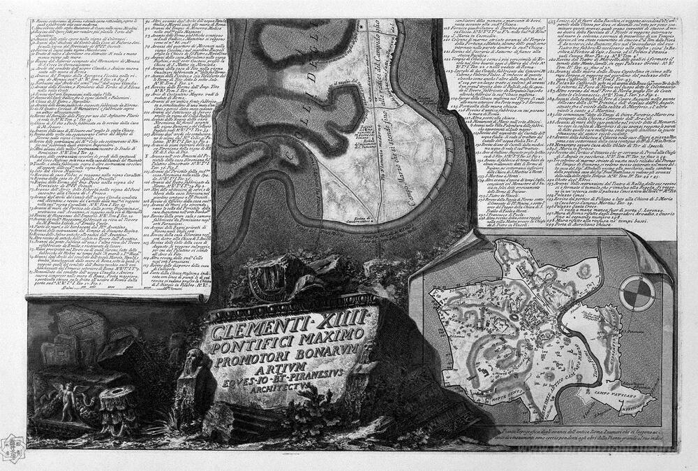 Ti offriamo una riproduzione artigianale su tela dell'opera famosa 'Mappa di Roma e del Campo Marzio con l'indice relativo e la dedi' di Giovanni Battista Piranesi, dal Museo delle Riproduzioni.