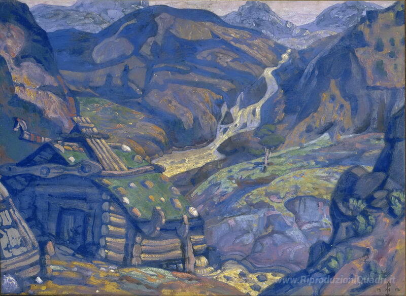 Ti offriamo una riproduzione artigianale su tela dell'opera famosa 'Mulino in montagna' di Nicholas Roerich, dal Museo delle Riproduzioni.