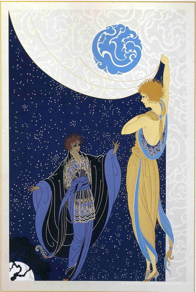Ti offriamo una riproduzione artigianale su tela dell'opera famosa 'Notturno' di Erte, dal Museo delle Riproduzioni.