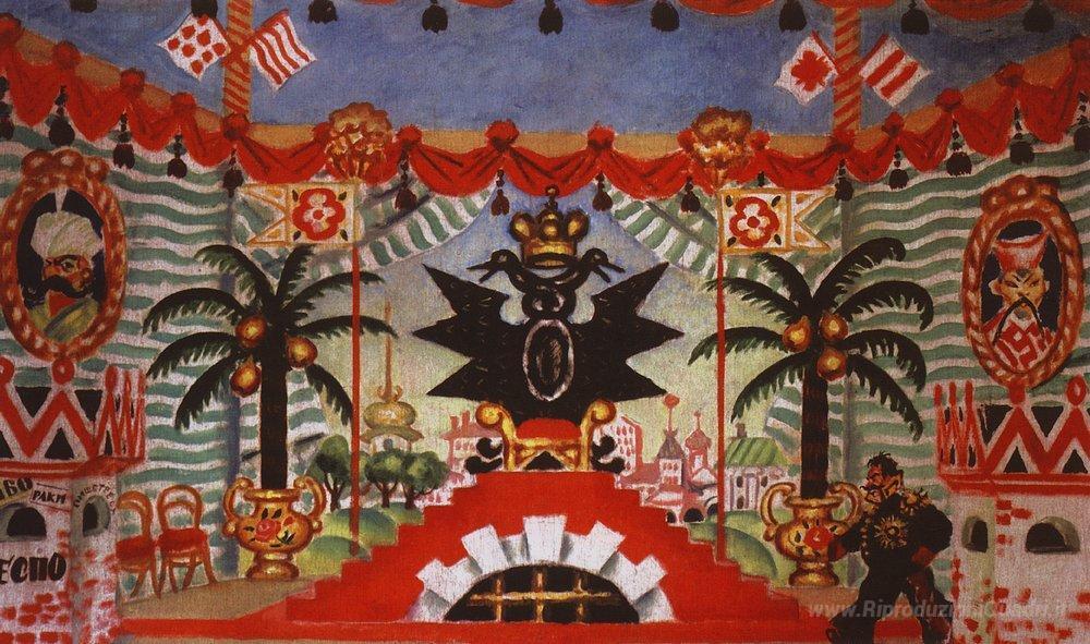 Ti offriamo una riproduzione artigianale su tela dell'opera famosa 'Palazzo, uno schizzo per il gioco di E. Zamyatin, 'La pulce'' di Boris Kustodiev, dal Museo delle Riproduzioni.