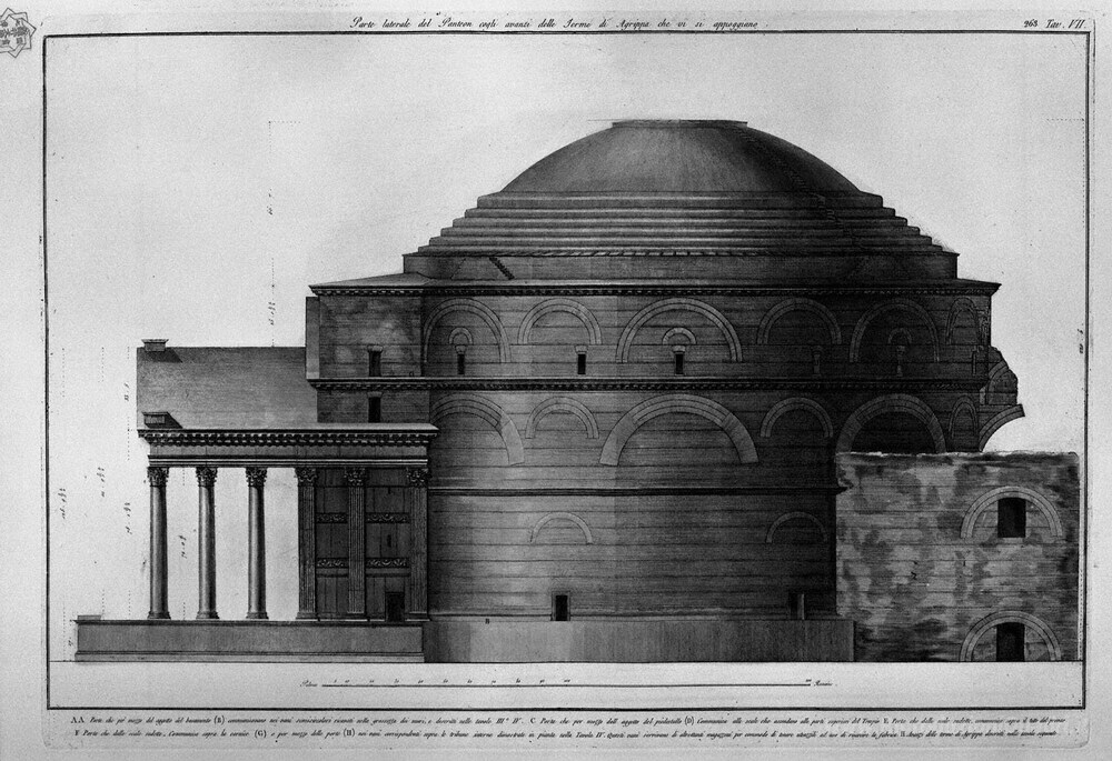 Ti offriamo una riproduzione artigianale su tela dell'opera famosa 'Parte laterale del Pantheon resti delle Terme di Agrippa, che so' di Giovanni Battista Piranesi, dal Museo delle Riproduzioni.