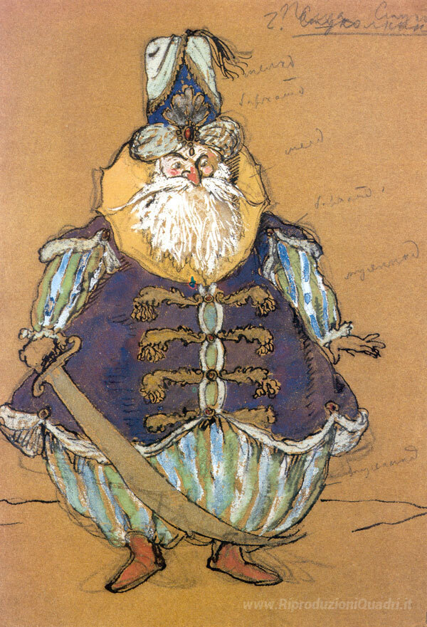 Ti offriamo una riproduzione artigianale su tela dell'opera famosa 'Pascià. Costumi per il balletto di Tcherepnin "Le Pavillon d'Arm' di Alexandre Benois, dal Museo delle Riproduzioni.