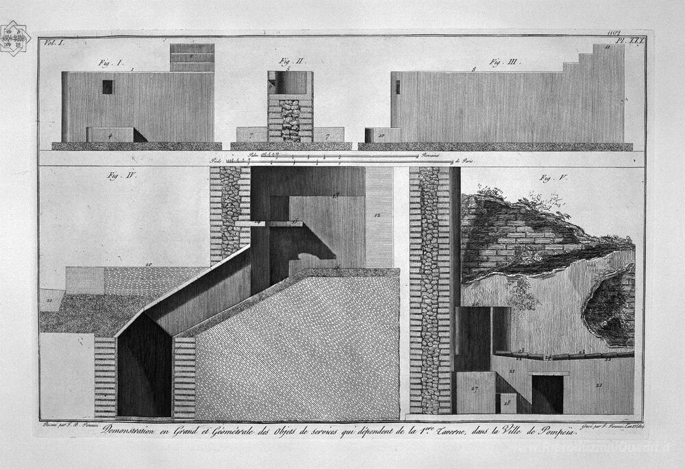 Ti offriamo una riproduzione artigianale su tela dell'opera famosa 'Pianta e sezione trasversale della prima osteria' di Giovanni Battista Piranesi, dal Museo delle Riproduzioni.