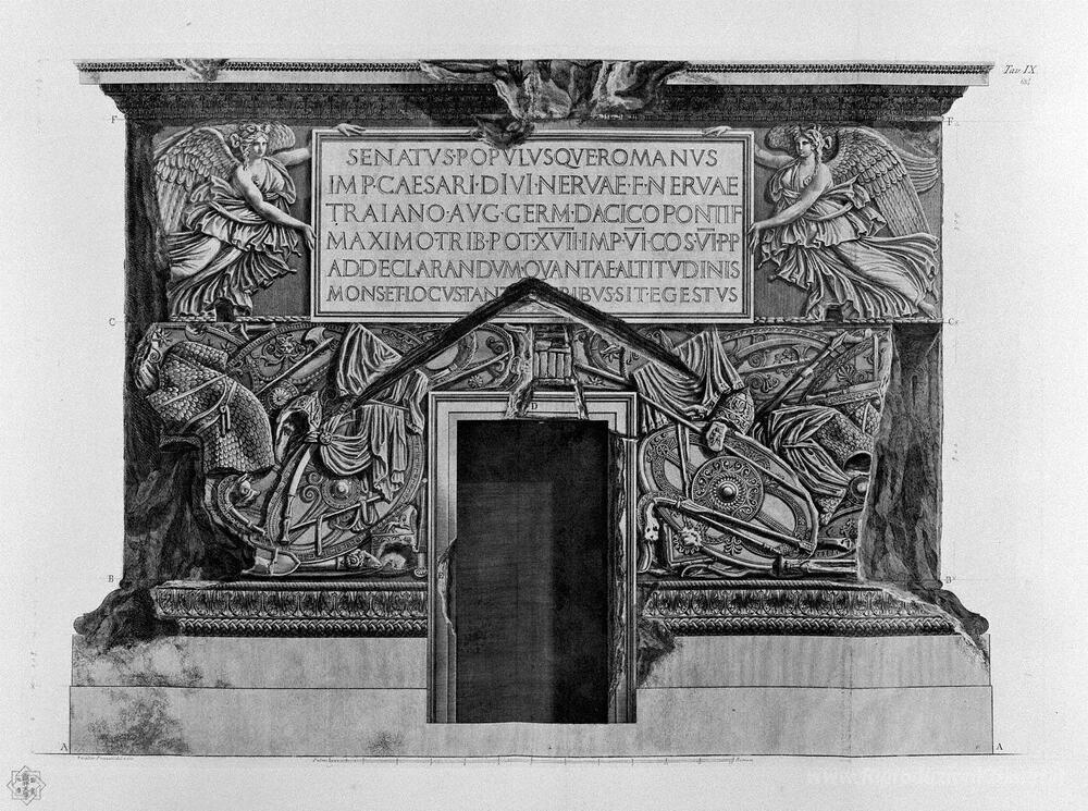 Ti offriamo una riproduzione artigianale su tela dell'opera famosa 'Piedistallo di Trajan`s Colonna' di Giovanni Battista Piranesi, dal Museo delle Riproduzioni.