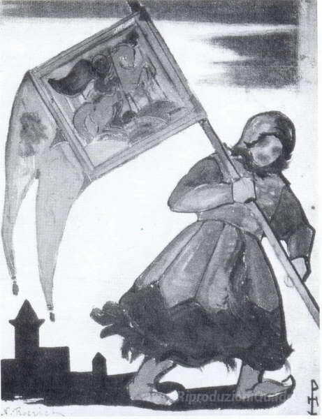 Ti offriamo una riproduzione artigianale su tela dell'opera famosa 'Portabandiera' di Nicholas Roerich, dal Museo delle Riproduzioni.
