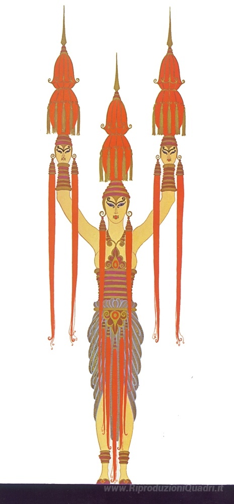 Ti offriamo una riproduzione artigianale su tela dell'opera famosa 'Portatore Lanterna, Tesori di Indocina' di Erte, dal Museo delle Riproduzioni.