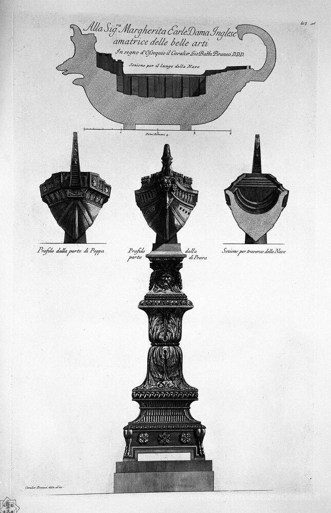Ti offriamo una riproduzione artigianale su tela dell'opera famosa 'Profili e sezioni della nave di cui sopra' di Giovanni Battista Piranesi, dal Museo delle Riproduzioni.