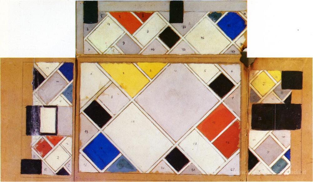 Ti offriamo una riproduzione artigianale su tela dell'opera famosa 'Progettazione del colore per le pareti e il soffitto della danza' di Theo van Doesburg, dal Museo delle Riproduzioni.