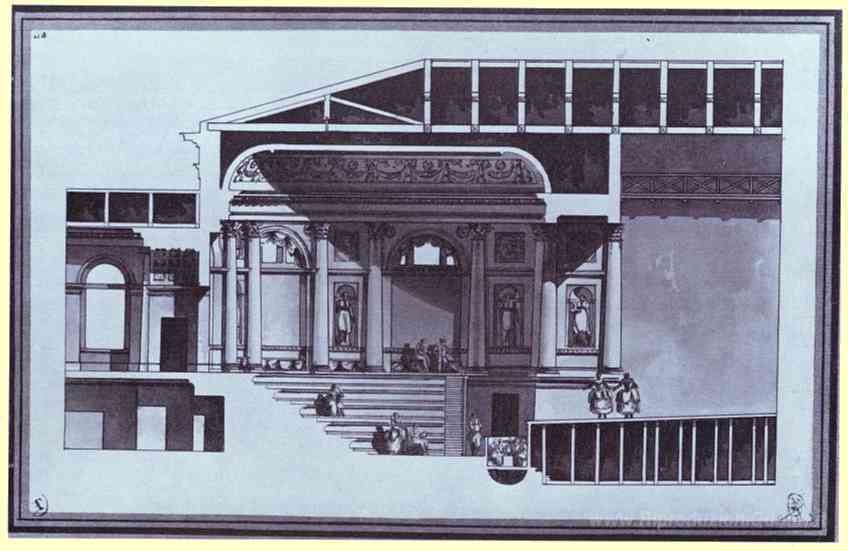 Ti offriamo una riproduzione artigianale su tela dell'opera famosa 'Progettazione del Teatro Hermitage di San Pietroburgo (sezione)' di Giacomo Quarenghi, dal Museo delle Riproduzioni.