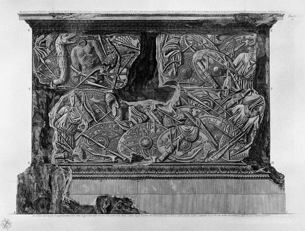 Ti offriamo una riproduzione artigianale su tela dell'opera famosa 'Quarto lato del piedistallo della stessa colonna' di Giovanni Battista Piranesi, dal Museo delle Riproduzioni.