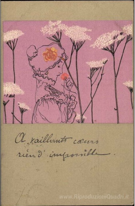 Ti offriamo una riproduzione artigianale su tela dell'opera famosa 'Ragazze con circonda verde oliva' di Raphael Kirchner, dal Museo delle Riproduzioni.
