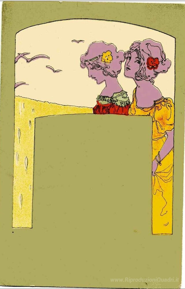 Ti offriamo una riproduzione artigianale su tela dell'opera famosa 'Ragazze con circonda verde oliva' di Raphael Kirchner, dal Museo delle Riproduzioni.