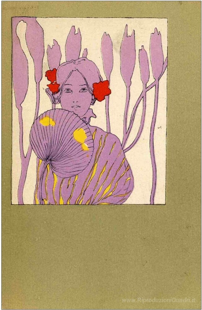 Ti offriamo una riproduzione artigianale su tela dell'opera famosa 'Ragazze con circonda verde oliva' di Raphael Kirchner, dal Museo delle Riproduzioni.