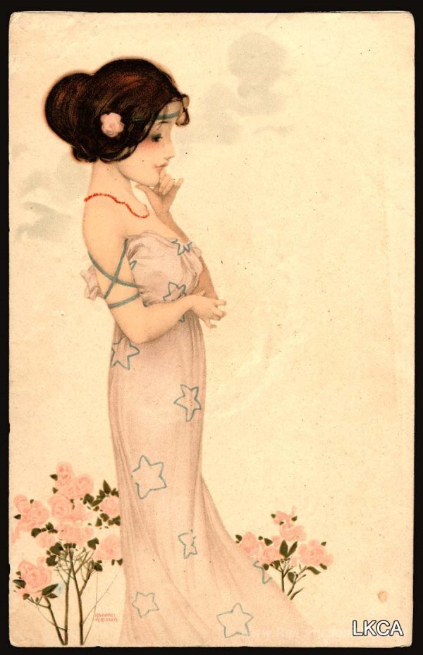 Ti offriamo una riproduzione artigianale su tela dell'opera famosa 'Ragazze con fiori ai piedi' di Raphael Kirchner, dal Museo delle Riproduzioni.