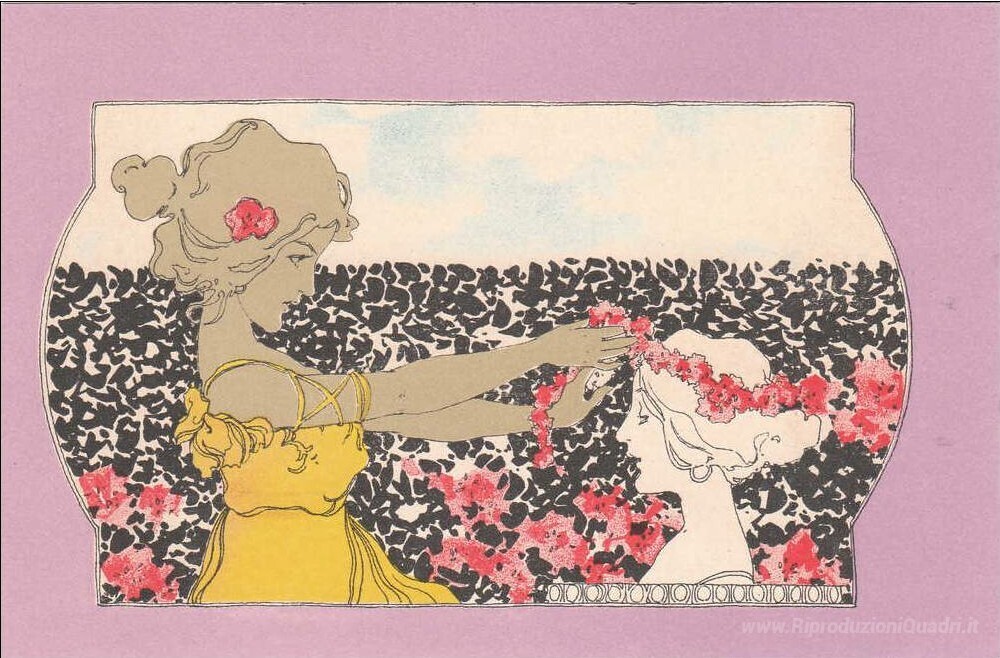 Scoprite la bellezza e l'eleganza di Ragazze con viola circonda, una straordinaria opera dell'artista austriaco Raphael Kirchner. Con un'abilità senza pari nel catturare l'essenza della femminilità, Kirchner combina elementi del simbolismo e del modernismo, dando vita a una composizione che celebra la sensualità e l'arte del ritratto. Le sue pennellate delicate e il suo uso magistrale del colore trasmettono un'atmosfera di intimità che riesce a coinvolgere l'osservatore.