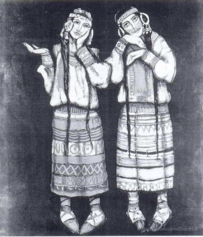 Ti offriamo una riproduzione artigianale su tela dell'opera famosa 'Ragazze' di Nicholas Roerich, dal Museo delle Riproduzioni.