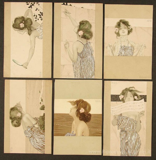 Ti offriamo una riproduzione artigianale su tela dell'opera famosa 'Ragazze tra i confini marrone-verde' di Raphael Kirchner, dal Museo delle Riproduzioni.