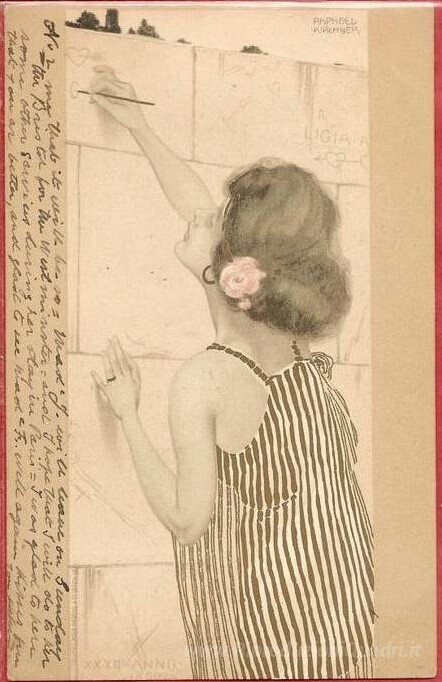 Ti offriamo una riproduzione artigianale su tela dell'opera famosa 'Ragazze tra i confini marrone-verde' di Raphael Kirchner, dal Museo delle Riproduzioni.