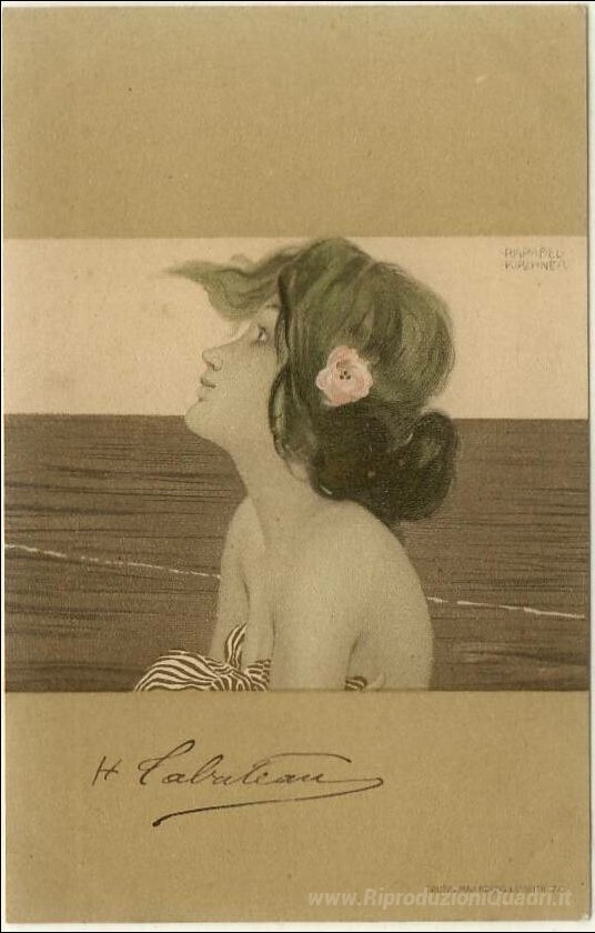 Ti offriamo una riproduzione artigianale su tela dell'opera famosa 'Ragazze tra i confini marrone-verde' di Raphael Kirchner, dal Museo delle Riproduzioni.