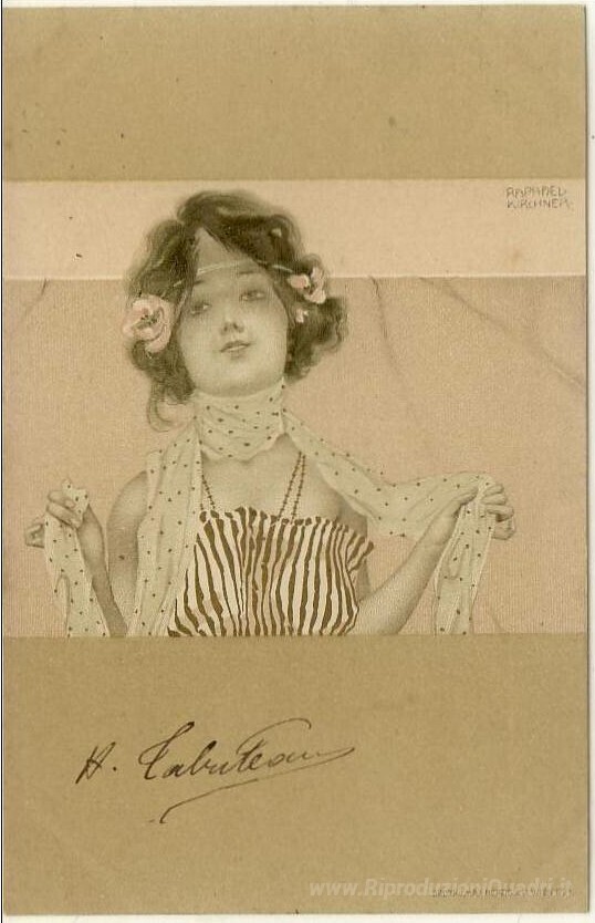 Ti offriamo una riproduzione artigianale su tela dell'opera famosa 'Ragazze tra i confini marrone-verde' di Raphael Kirchner, dal Museo delle Riproduzioni.