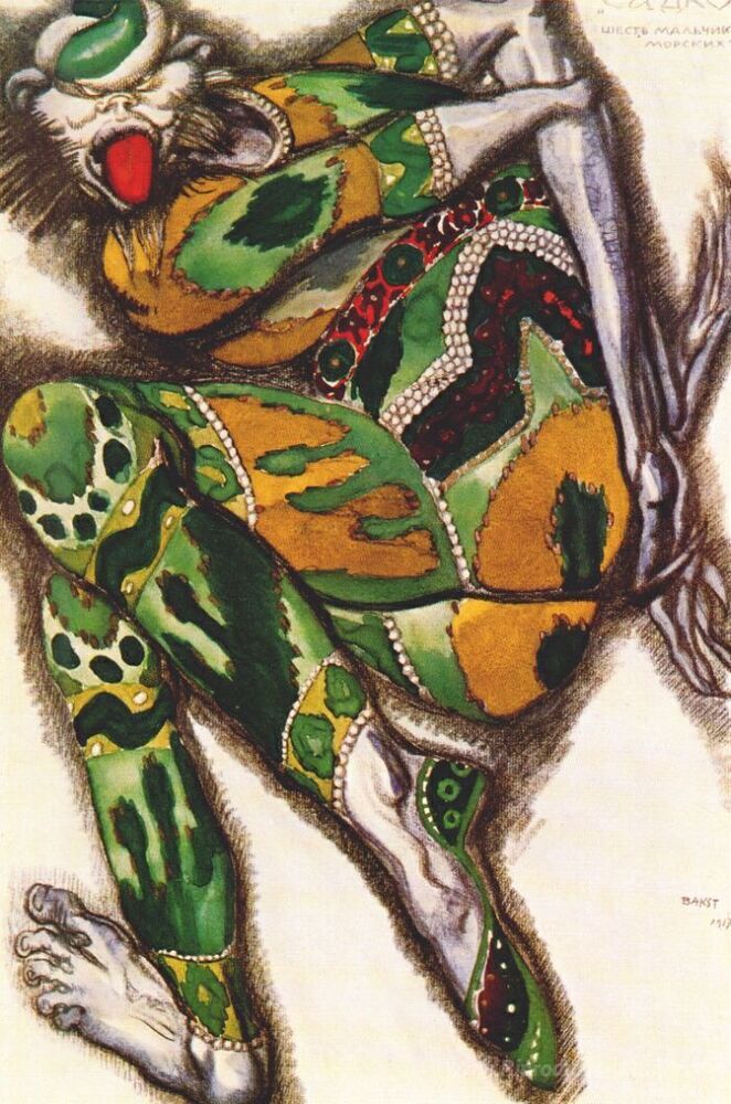 Ti offriamo una riproduzione artigianale su tela dell'opera famosa 'Sadko il Green Monster' di Leon Bakst, dal Museo delle Riproduzioni.