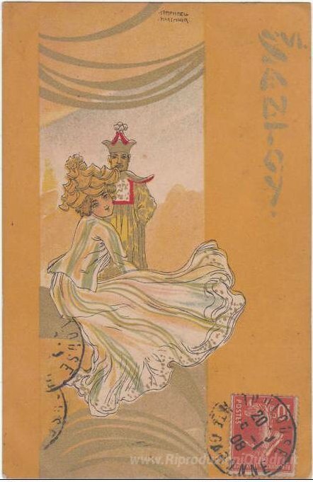 Ti offriamo una riproduzione artigianale su tela dell'opera famosa 'Santoy' di Raphael Kirchner, dal Museo delle Riproduzioni.
