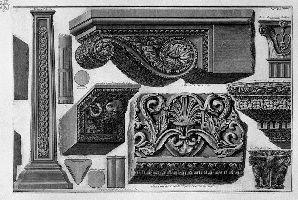Ti offriamo una riproduzione artigianale su tela dell'opera famosa 'Scaffale, capitelli, fregi, ecc' di Giovanni Battista Piranesi, dal Museo delle Riproduzioni.