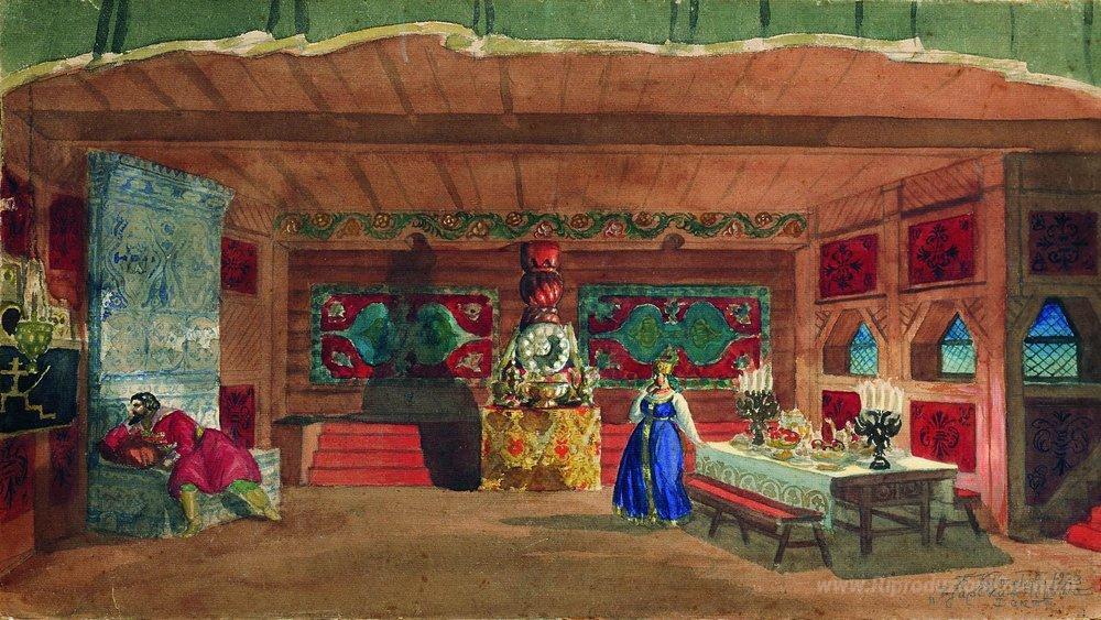 Ti offriamo una riproduzione artigianale su tela dell'opera famosa 'Scenografia dell'opera di Nikolai Rimsky-Korsakov la 'sposa dell' di Boris Kustodiev, dal Museo delle Riproduzioni.
