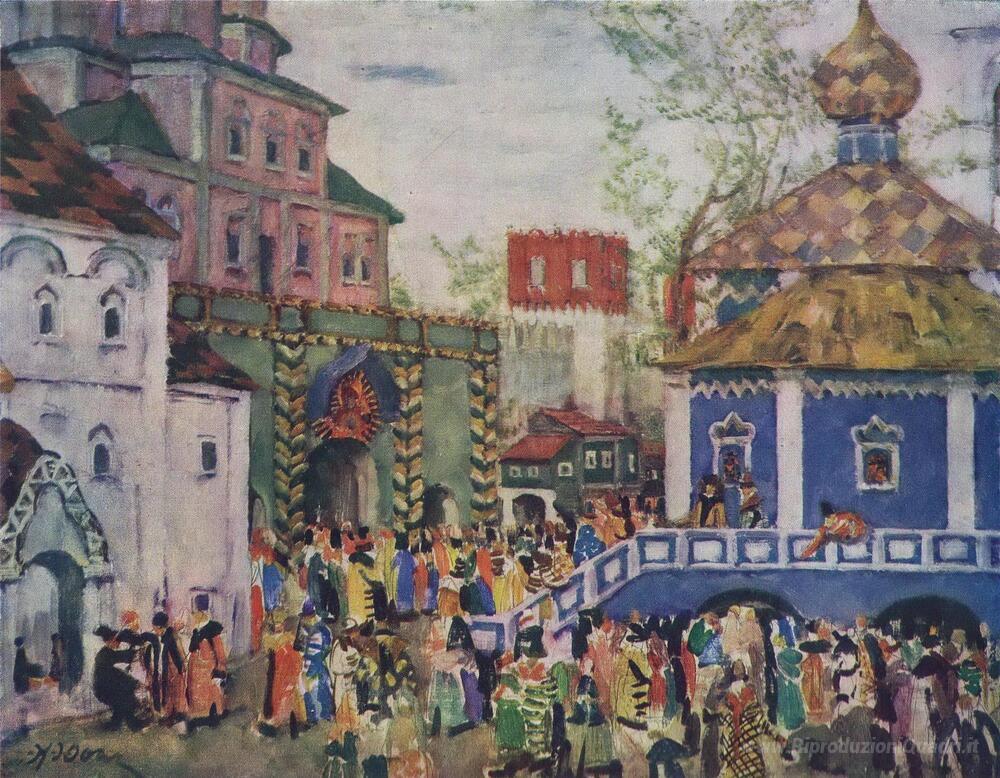 Ti offriamo una riproduzione artigianale su tela dell'opera famosa 'Scenografia per l'opera di Musorgskij 'Boris Godunov'' di Konstantin Yuon, dal Museo delle Riproduzioni.