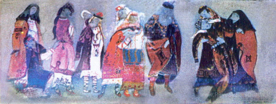 Ti offriamo una riproduzione artigianale su tela dell'opera famosa 'Schizzi di costumi per "Il principe Igor"' di Nicholas Roerich, dal Museo delle Riproduzioni.
