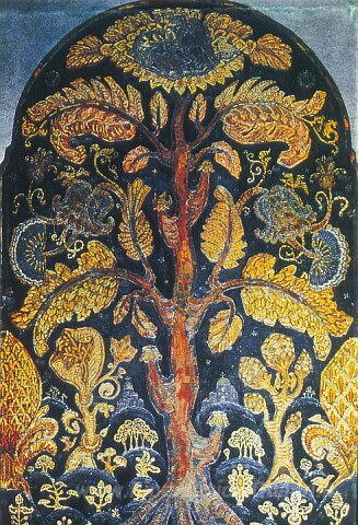 Ti offriamo una riproduzione artigianale su tela dell'opera famosa 'Schizzo del mosaico al monumento a Kuinji' di Nicholas Roerich, dal Museo delle Riproduzioni.