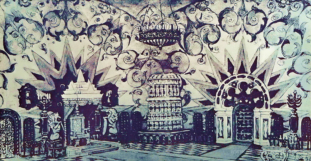 Ti offriamo una riproduzione artigianale su tela dell'opera famosa 'Schizzo di Guai commedia racconto Marshak 'da temere - la felici' di Konstantin Yuon, dal Museo delle Riproduzioni.