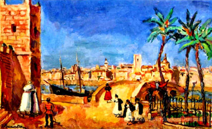 Ti offriamo una riproduzione artigianale su tela dell'opera famosa 'Set arredamento per l'opera 'Carmen' di Georges Bizet' di Pyotr Konchalovsky, dal Museo delle Riproduzioni.