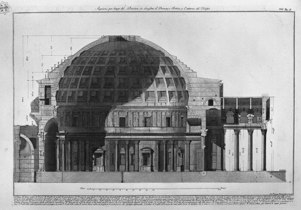 Ti offriamo una riproduzione artigianale su tela dell'opera famosa 'Sezione lungo il Pantheon, che mostra il pronao o portico e l'in' di Giovanni Battista Piranesi, dal Museo delle Riproduzioni.