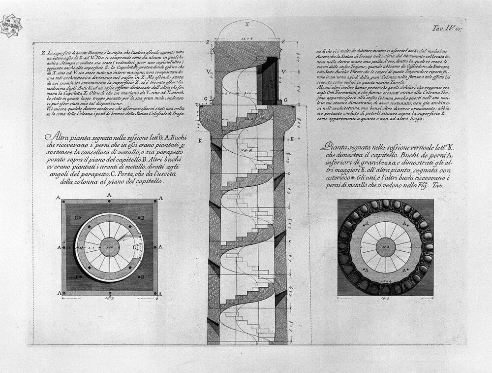 Ti offriamo una riproduzione artigianale su tela dell'opera famosa 'Sezione verticale della colonna Traiana, con sei stabilimenti pr' di Giovanni Battista Piranesi, dal Museo delle Riproduzioni.
