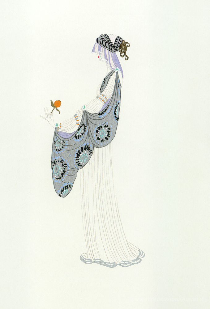Ti offriamo una riproduzione artigianale su tela dell'opera famosa 'Signora con una Rosa' di Erte, dal Museo delle Riproduzioni.