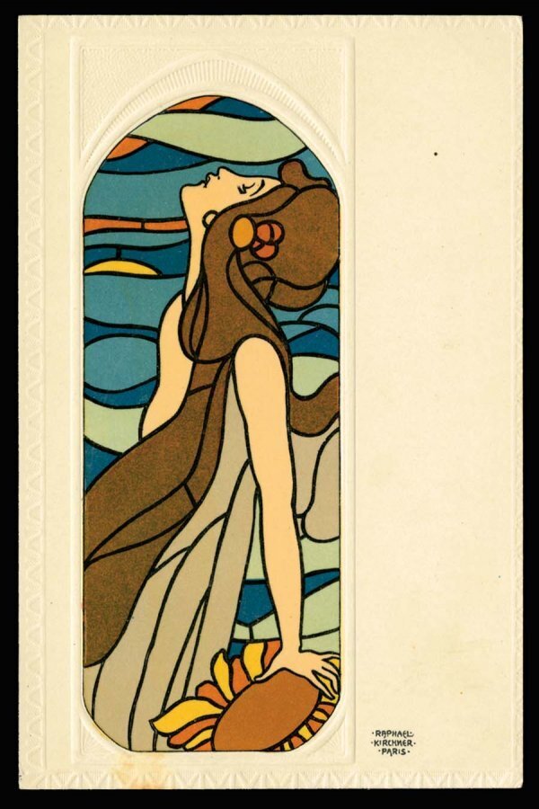 Ti offriamo una riproduzione artigianale su tela dell'opera famosa 'Stained Glass Art' di Raphael Kirchner, dal Museo delle Riproduzioni.